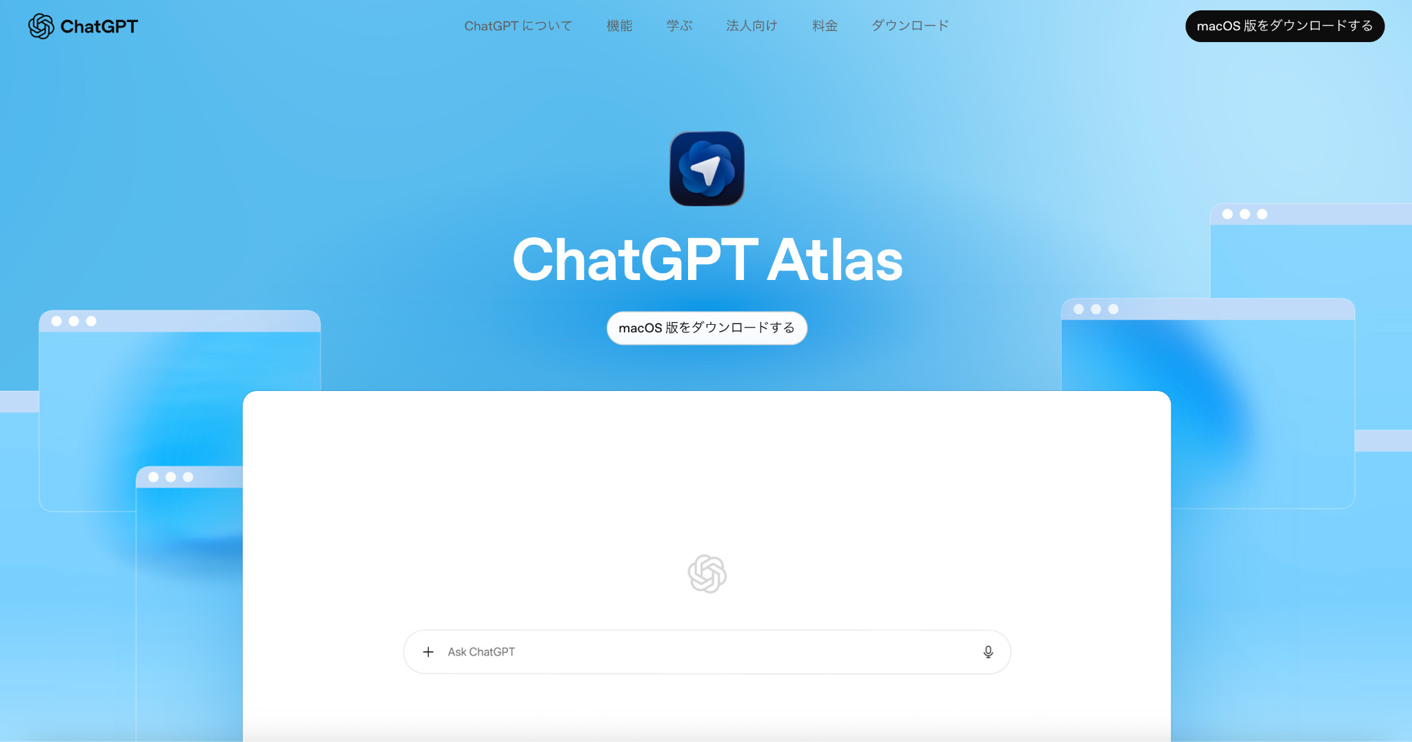 読者の皆さん、ニュースです! 生成AIの代名詞ともなっている「ChatGPT」からWebブラウザがリリースされました。その名も「ChatGPT Atlas」(アトラス)。コラム執筆時点(2025年11月初)ではMac版しかリリースされていないようですが、普段使いするブラウザとして、一体どんなメリットがあるんでしょう? 早速インストールして触ってみようと思います。