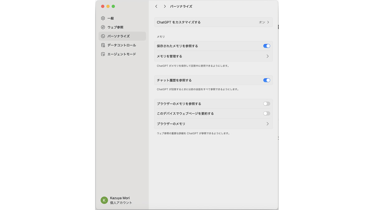 これまでに自分がどんなサイトを閲覧したか、どんな質問をChatGPTにしたか等など……。そんな情報からあなたの望む答えに近づけてくれるような機能と思えばよいでしょうか。人によっては「気持ち悪い」と感じるかもしれませんので、その場合はOFFにしましょう。