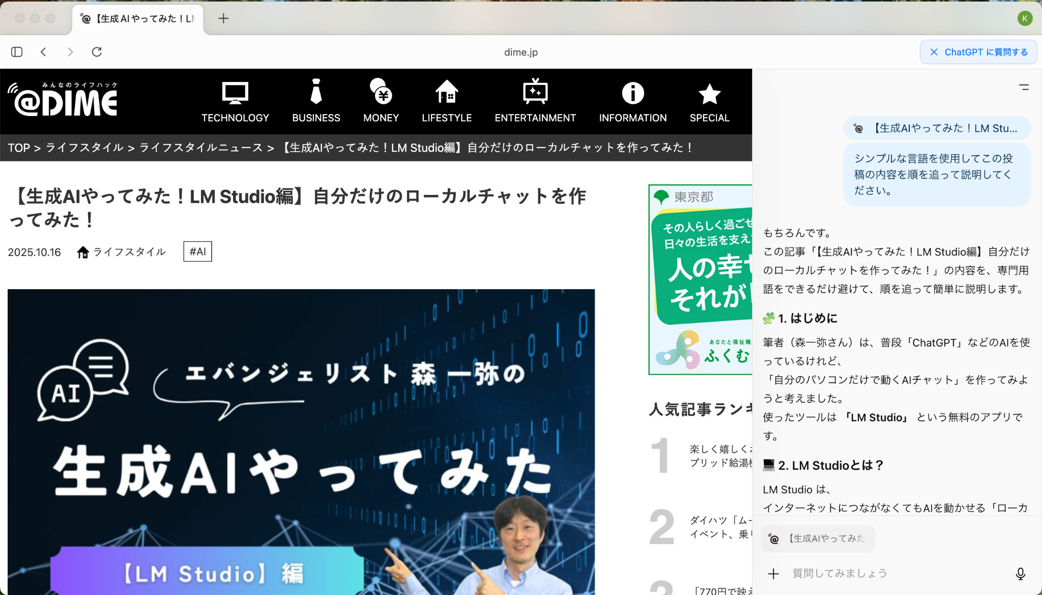 例えば、「@DIME」のページを表示して「ChatGPTに質問する」ボタンを押してみました。