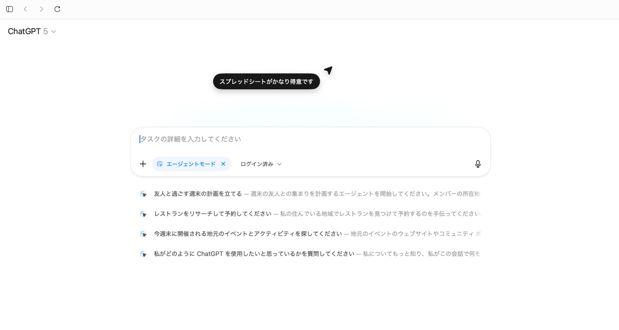 さて、Home画面でも表示されていた「エージェントモード」も少し触ってみたいと思います。エージェントモードをクリック、または、入力欄の「+」ボタンからエージェントモードを選ぶことで利用できるようになります。