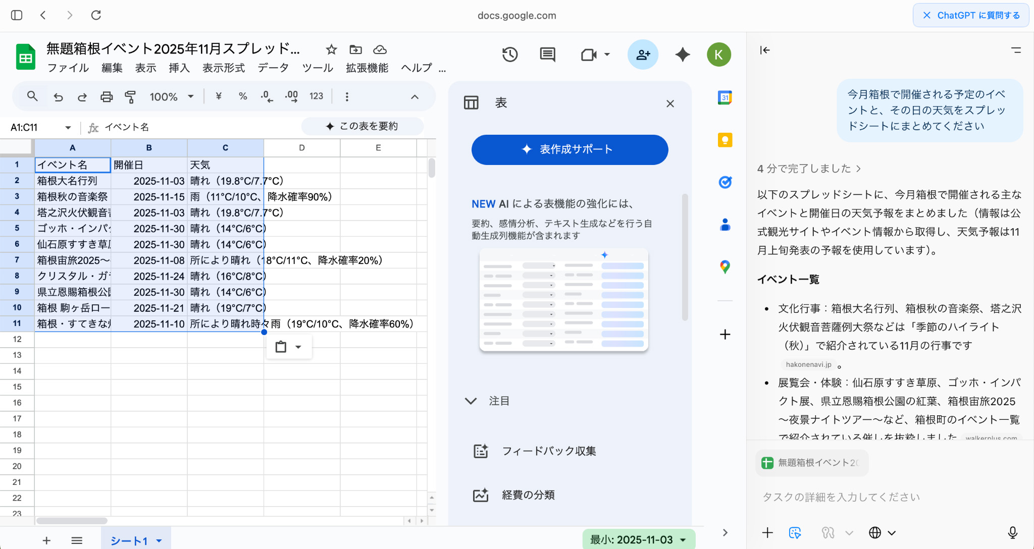 AIエージェントによるイベント情報の検索が始まると同時に、スプレッドシートが表示されました。暫く待つこと、約4分ほどで、箱根で開催予定のイベントの一覧表が出来上がりました。