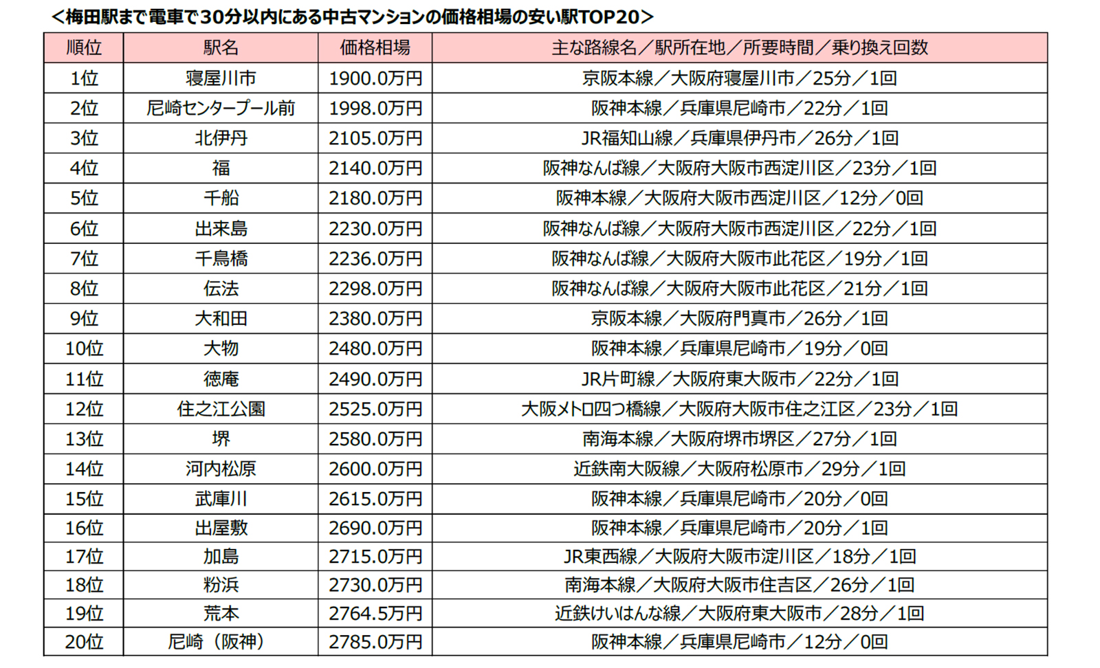 「梅田駅まで30分以内・中古マンションの価格相場の安い駅ランキング2025年」概要