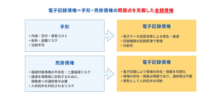 これは、手形や小切手の問題点を克服する電子データであり、インターネットバンキングなどを通じて取引きでる金銭債権です。