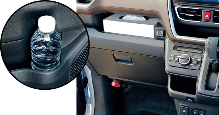 箱ティッシュはココ。500~600mlペットボトルはココ! お菓子はココ! 時代のニーズに応える各種収納。スマホ充電はQiで。