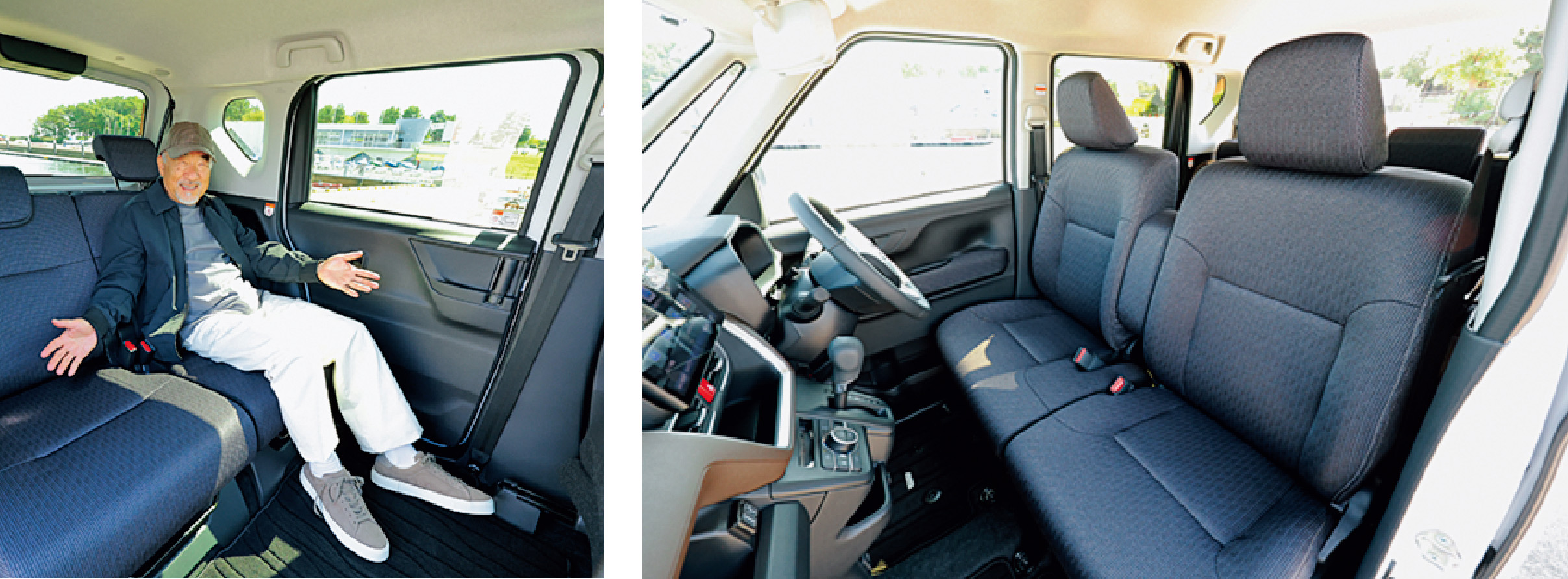長時間座っても疲れにくいシート、チルト可能なハンドルで快適。リクライニング可能なリアシートは普通車をしのぐ(⁉)広さを実現。