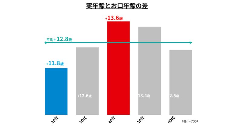 全国調査の結果、”お口年齢”は実年齢より平均12.8歳高いことが判明。年代別に見ると、実年齢との差が最も大きかったのは40代で+13.6歳。一方、差が最も小さかったのは20代で+11.8歳となった。