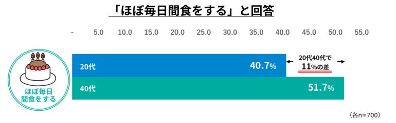 一方で、実年齢との差が最も小さかった20代では、「ほぼ毎日間食をする」と答えた人は40.7%にとどまり、40代と比べて11ptも低い結果となった。間食の回数が少ないことで、オーラルケアが必要なタイミングでしっかりケアできている可能性が考えられる。