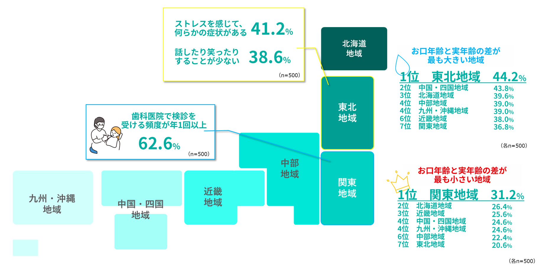 これらの結果から、「東北地域」の方はストレスや日常の生活環境といった要因が、お口の状態やお口年齢に影響している可能性が考えられる。