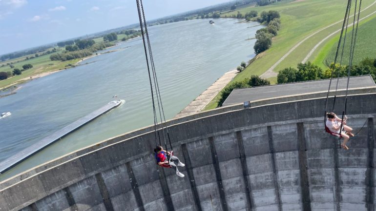 徐々に上がっていきますが、た、高いー!!なんと最高58メートルまで上がるそう。一番上まで上がった時は冷却塔の高さを超え、外がよく見える絶景!そして冷却塔の高さや規模の大きさも実感しました。しかしポール席でよかった・・・。回転ブランコ席の人たち、ほんと勇気あるなぁ。
