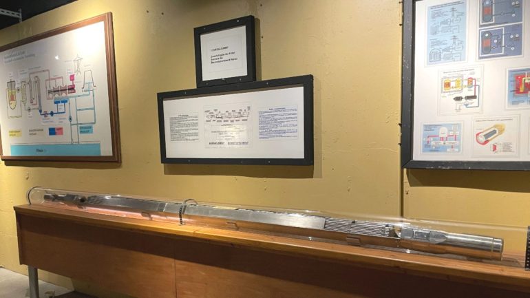 燃料棒の模型。稼働されなかったため、核燃料はそのまま他国の原子力発電所に移送されたそう。説明資料ではその後日本にも売却されたと書かれていた。