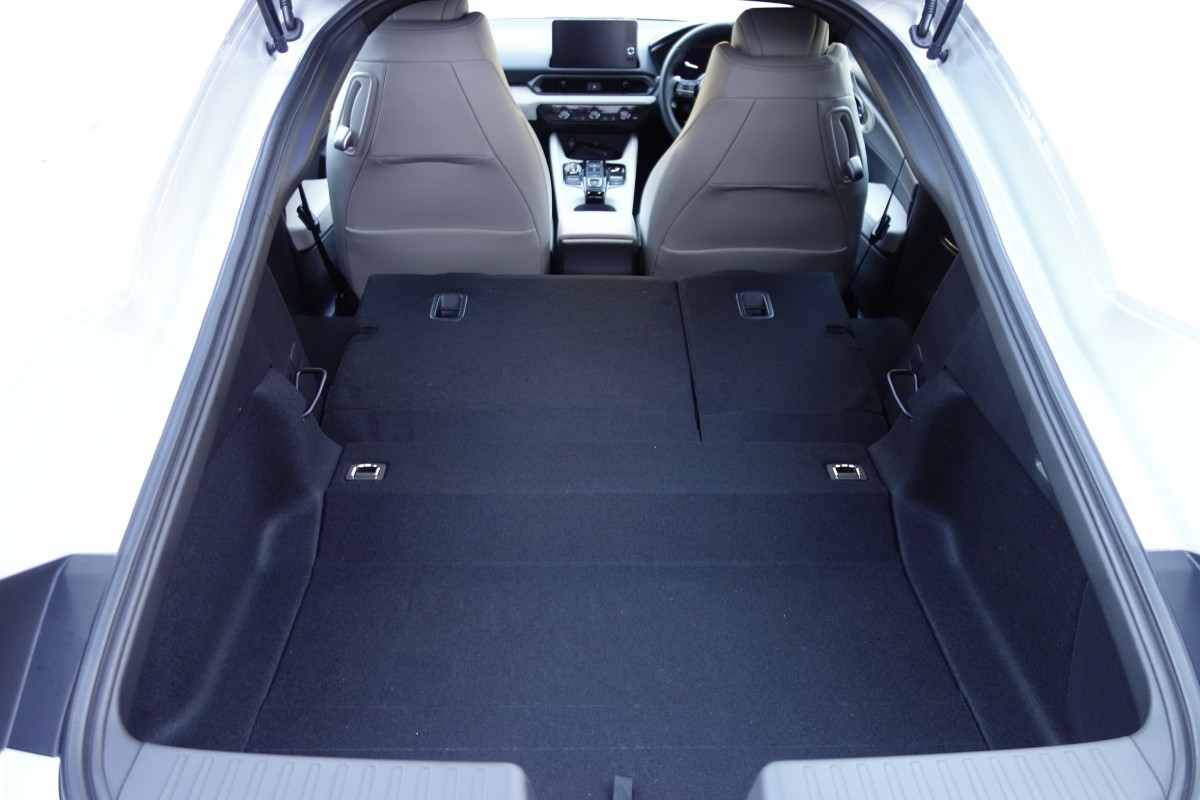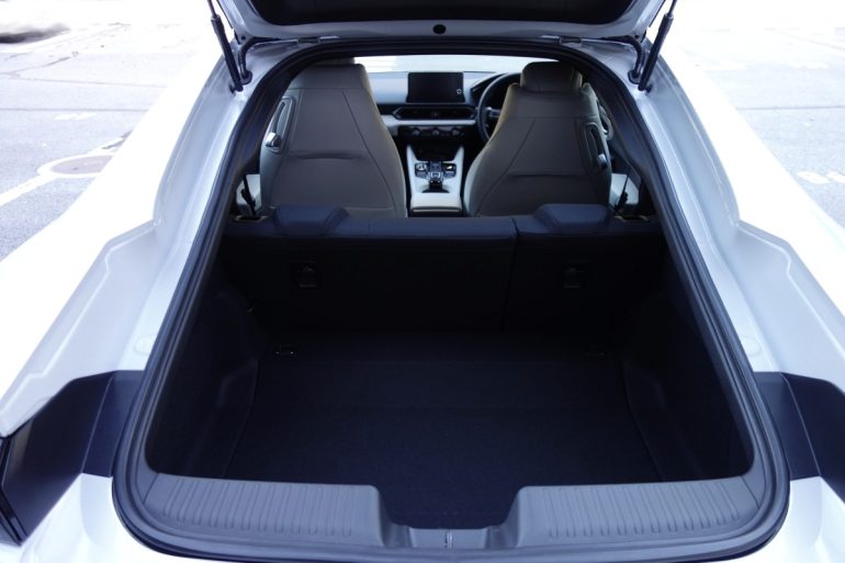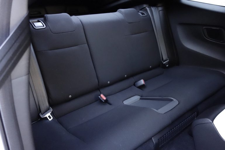 後席はあくまで2+2のシートであり、およそ身長140~150cmまでの乗員向きだ。足元はポルシェ911やトヨタ86よりもやや余裕があるものの、頭上方向は狭く、頭がリヤガラス部分になるから暑い時期の乗車には不向きだろう。とはいえ、使い方としては80年代のデートカーのごとく、カップルやシングルで楽しむスポーティクーペであり、後席は荷物置き場、または倒して、通常状態でも広々としたラゲッジルームの奥行きをさらに稼いで使うのが正解だろう。ちなみに後席を倒すと奥行きは約1720mmに達し、ちょうどボクがまっすぐ寝ることもできるスペースが出現(僅かな段差はあるが)。もちろん、ゴルフバックの積載もOKというわけだ。