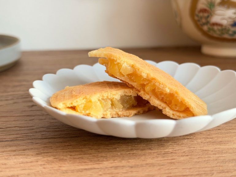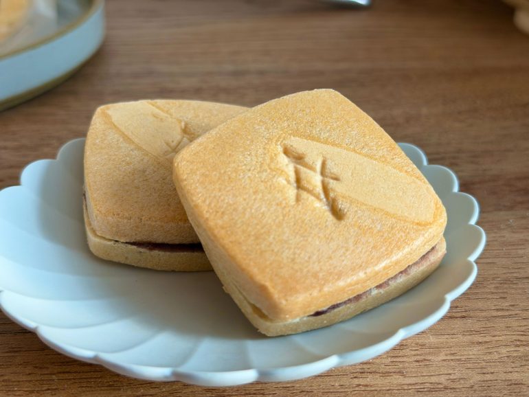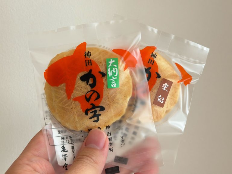 さて神田かの字は、大納言と栗餡の2種類をラインアップするお菓子。一見、パリッとした焼き菓子に餡が挟まれているタイプのお菓子に見えるが、実は皮はしっとり。どら焼きの皮を薄ーくしたものがイメージ近いと思う。