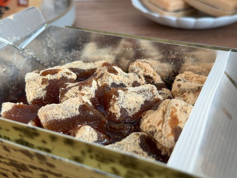 箱を開けて黒蜜をトロリと垂らし…食べる。うまい。1箱にしっかり量が入っているため、シェア前提で買うのがいいだろう。もちろん、独り占めするのもありだ。