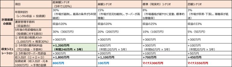 シミュレーションの見方だが、「収入合計」は、投資したGPUサーバーからどのくらいの収入が得られるかを計算した。また、投資結果は、元本を差し引いた金額で最終的な手残りの金額となる。例えば「楽観シナリオ」では、100万円が手に残るので、投資に対するリターン(ROI)は、5年で10%となる。