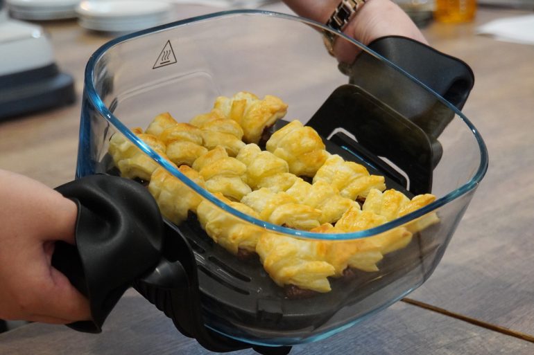 一般的な分離型エアフライヤーでは、コンテナに大きなハンドルが付いたバスケット型が主流。一方、Crispiはキャセロール皿のようなガラスコンテナを採用しており、ボウルのようにコンテナ内で下ごしらえや調味がしやすい。