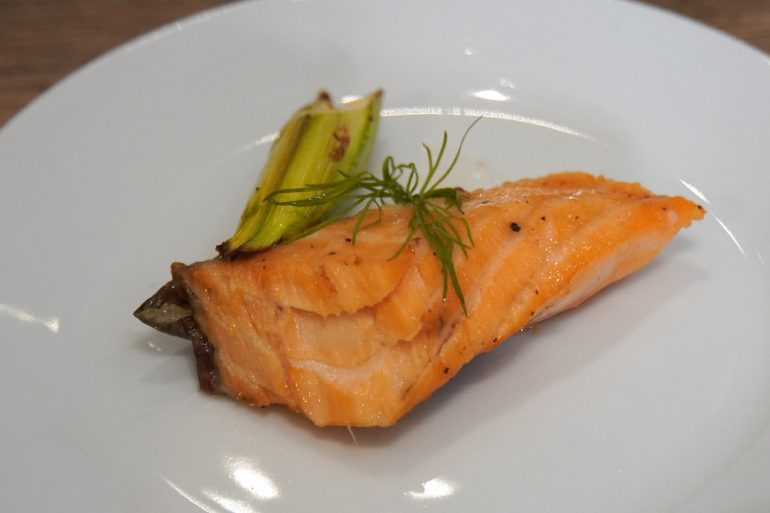 作ったのは「サーモンのレモンハーブグリル」。サーモンとアスパラガスをコンテナに並べ、塩・胡椒・ガーリックパウダーをふり、オリーブオイルとレモンスライスをのせてクリスプモードで約10分加熱するというシンプルなレシピだ。洗い物がほとんど出ないうえに、特別な下ごしらえも不要な一皿だが、見た目にも美しく、完成度の高い仕上がりだった。