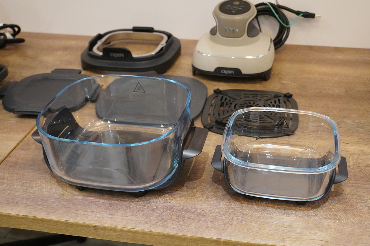 一般的な分離型エアフライヤーでは、コンテナに大きなハンドルが付いたバスケット型が主流。一方、Crispiはキャセロール皿のようなガラスコンテナを採用しており、ボウルのようにコンテナ内で下ごしらえや調味がしやすい。
