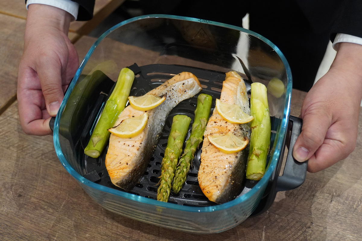 作ったのは「サーモンのレモンハーブグリル」。サーモンとアスパラガスをコンテナに並べ、塩・胡椒・ガーリックパウダーをふり、オリーブオイルとレモンスライスをのせてクリスプモードで約10分加熱するというシンプルなレシピだ。洗い物がほとんど出ないうえに、特別な下ごしらえも不要な一皿だが、見た目にも美しく、完成度の高い仕上がりだった。