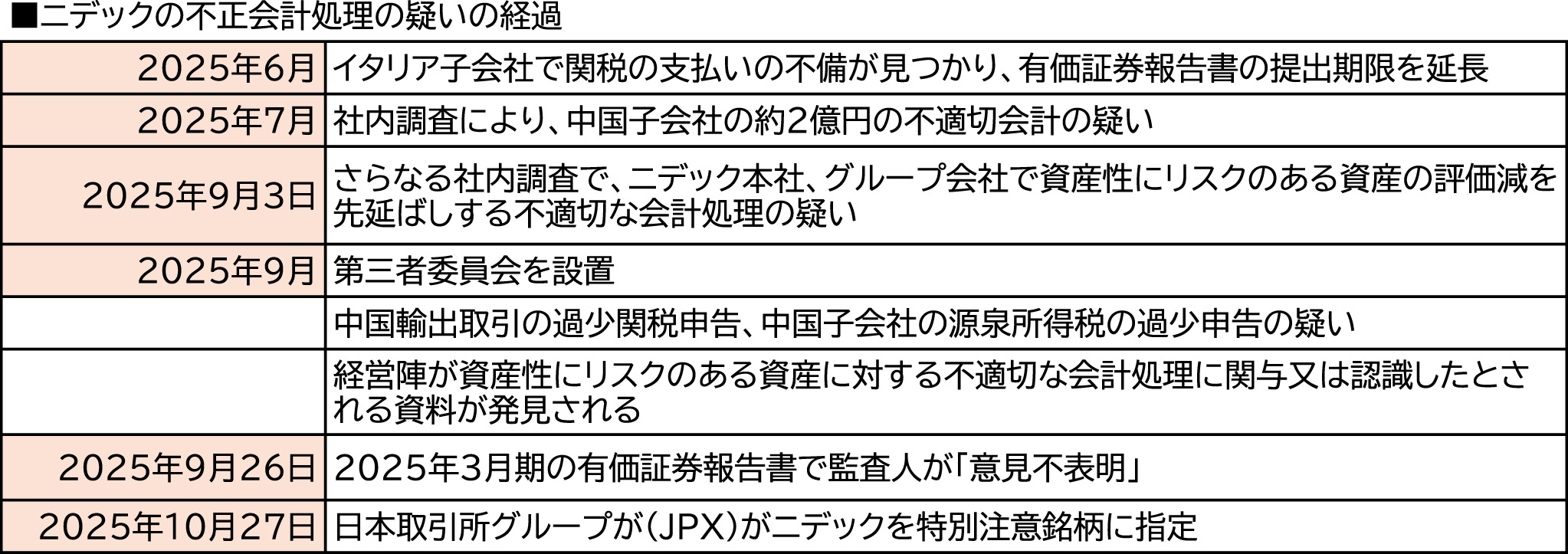まず、ニデックのイタリア子会社が、申告に誤りがあり、未払いの関税が発生した。そこで、第三者の専門家と社内調査が行われたが、7月に中国子会社で2024年9月下旬にサプライヤーからの値引き(約2億円)に関して不適切な会計処理が行われた疑いが出た。