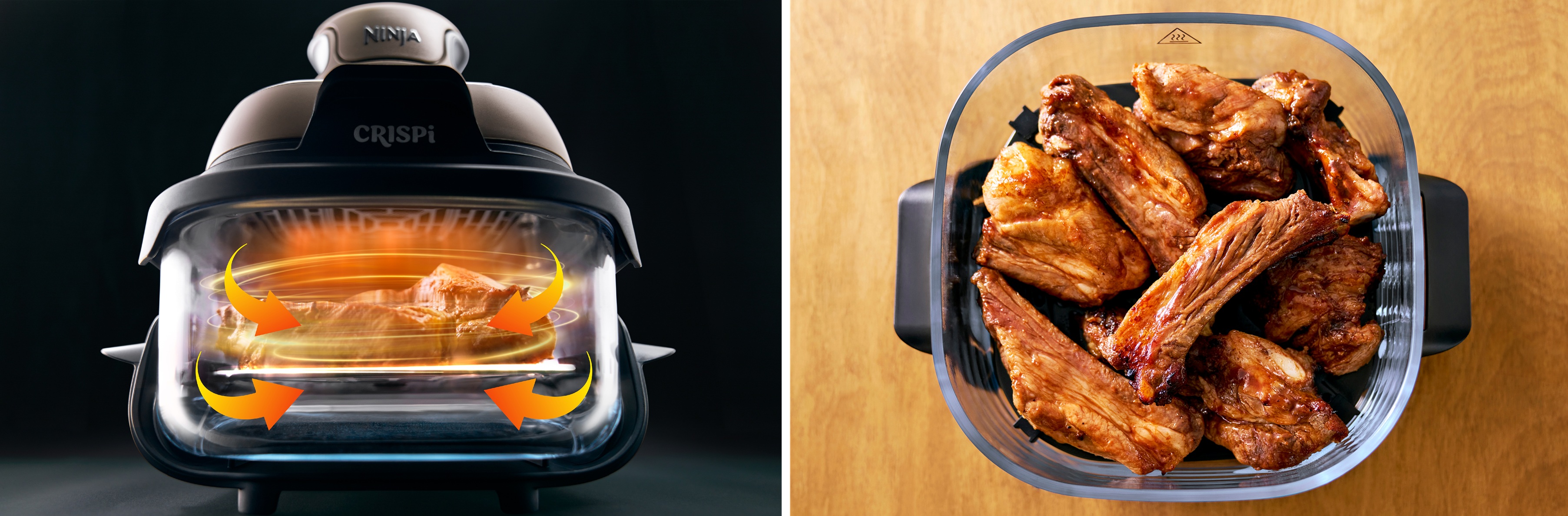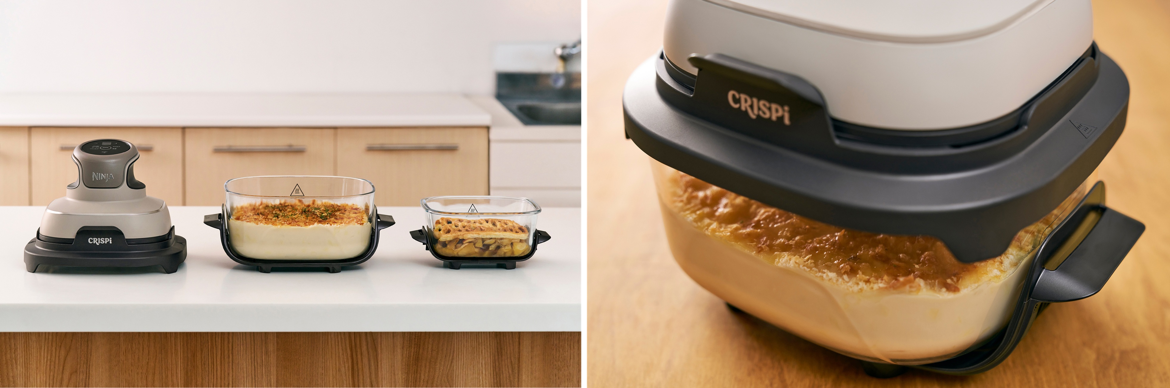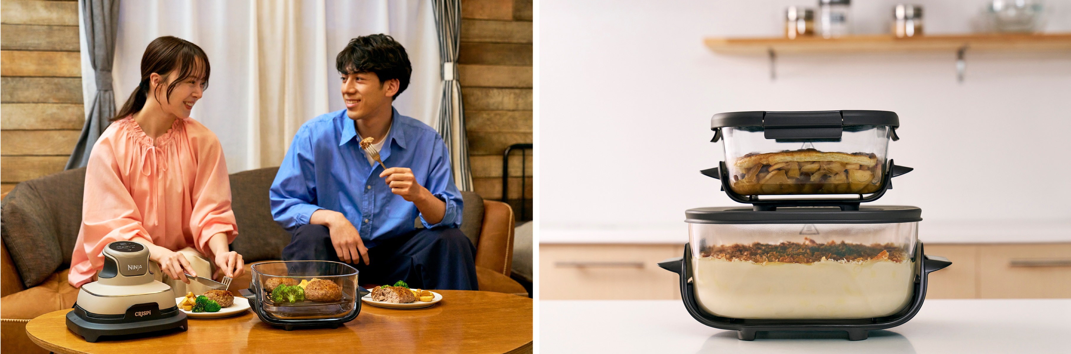 発売する3製品は、これまでの料理時間をより「簡単、おいしい、楽しく」に変え、新しい体験を提供する加熱調理家電。「Ninja Crispi テーブルクッカー」は、ガラスコンテナに食材を入れて「下ごしらえ、加熱調理、サーブ、保存、温め直し」までが1台で完結できる、新感覚のテーブルクッカー。強力熱風ファン、高火力ヒーター、高熱伝導プレートの組み合わせにより、ジューシーで本格的な仕上がりを実現する。