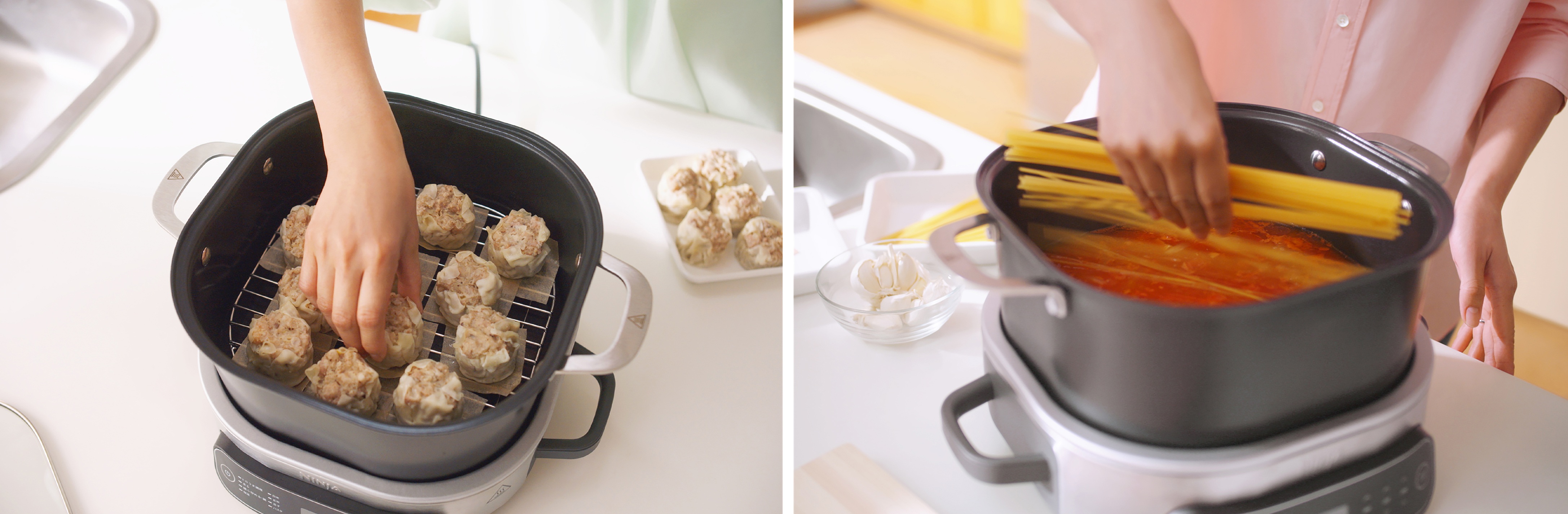 一般的な焼く・炒める・煮る、ゆでる以外にも、鍋料理・蒸す・炊く・煮込むなどのさまざまな料理に応用できるため、レシピの幅が広がり、毎日の献立の選択肢は無限大に広がる。