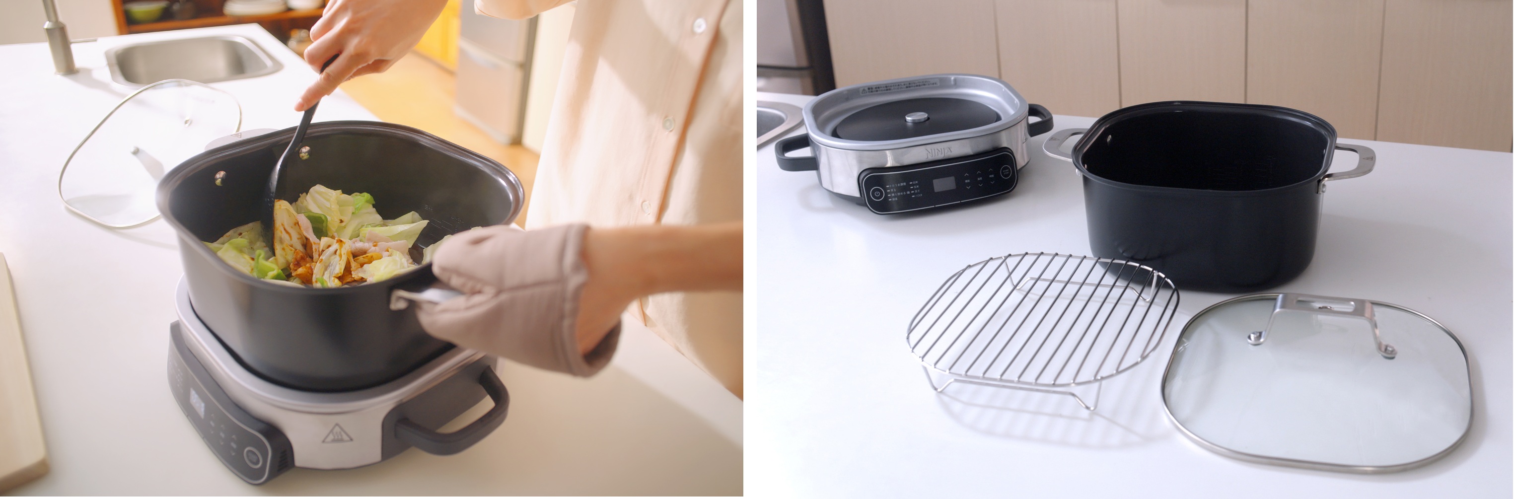 「Ninja エブリデーポッシブルクッカー」は、焼く/炒める/煮る/蒸す/炊く/(パスタを)ゆでる/とろ火で煮込む/お鍋 の8つの調理方法と8個の調理器具の機能を集約した万能クッカー。各調理モードに最適な火加減が設定されており、日常の料理からこだわりの一品まで誰でも簡単に料理ができる。