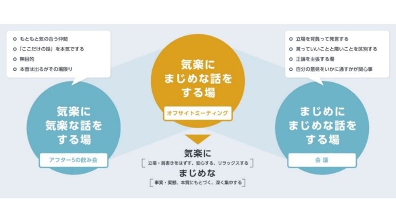 ぜひ、オフサイトミーティングのような話し合いの場を活用して、立場や役職に縛られない、“フラットな対話”に身を置いてみていただきたいと思います。
