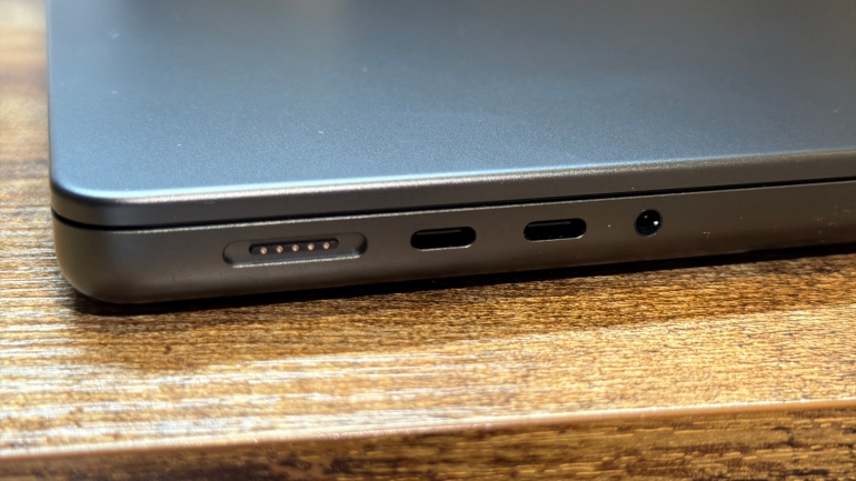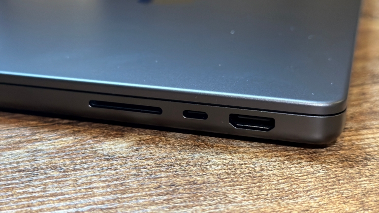 ポート類が豊富なのも、やはり上位モデルの魅力。USBハブを用意する必要がないと、デスクの整理にも繋がり、発熱等の不安も取り除かれる。加えて、今回は試せていないため、深く言及していないが、低反射ディスプレイのNano-textureディスプレイを選択できるのも、MacBook Proならではの特徴だろう。