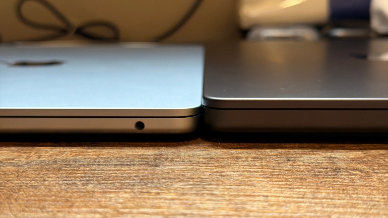 一方、MacBook Air(M4)と比べると、やはり重さと厚さはそれなりに気になる。スペックを見比べると、質量は0.31kg、厚さは0.42cmの違い。数字的には「その程度の違いか」と思わなくもないが、実際にカバンに入れて持ち運んだり、手に持つと、かなり違いを感じる。最近のMacBook Airは軽くない、薄くないという意見もよく耳にする(個人的にもそう思う)が、MacBook Proを基準とすると、軽くて薄いモデルなんだなと思わされた。