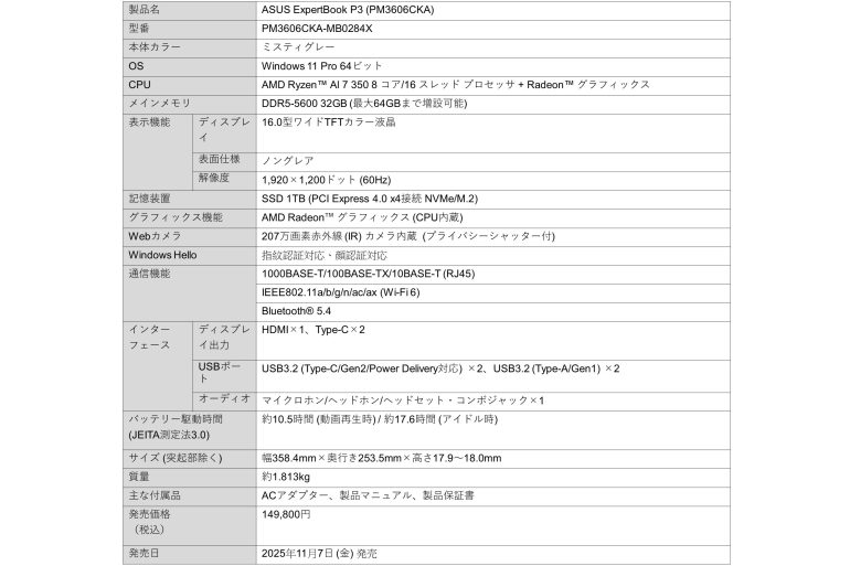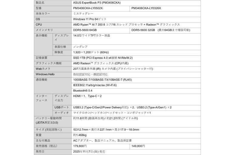「ASUS ExpertBook P3 (PM3406CKA/PM3606CKA)」は、AMD Ryzen AI 7 350を搭載した、Copilot+PC準拠のノートPC。メモリは32GB/64GB、ストレージは1TB SSDを内蔵し、OSはWindows 11 Proをプリインストールする。