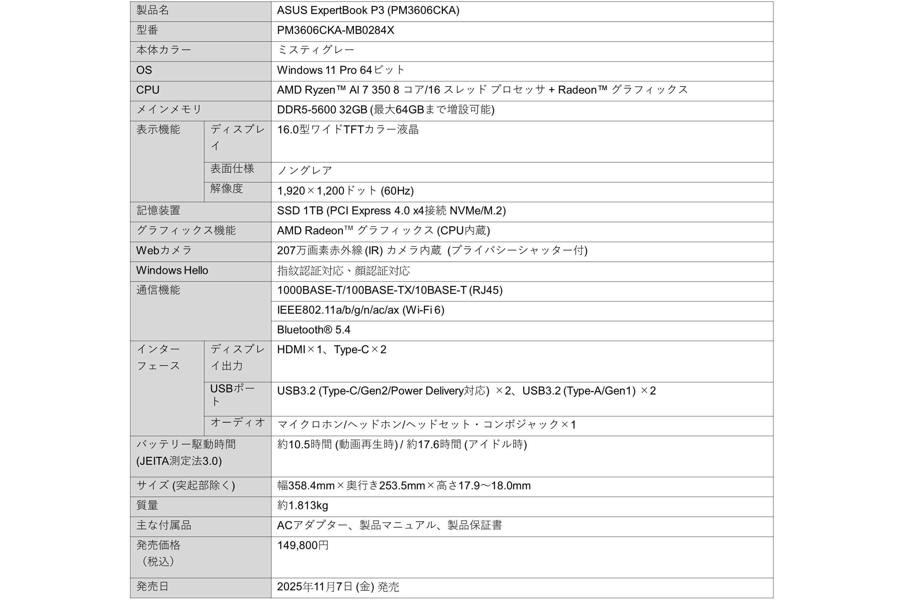 「ASUS ExpertBook P3 (PM3406CKA/PM3606CKA)」は、AMD Ryzen AI 7 350を搭載した、Copilot+PC準拠のノートPC。メモリは32GB/64GB、ストレージは1TB SSDを内蔵し、OSはWindows 11 Proをプリインストールする。