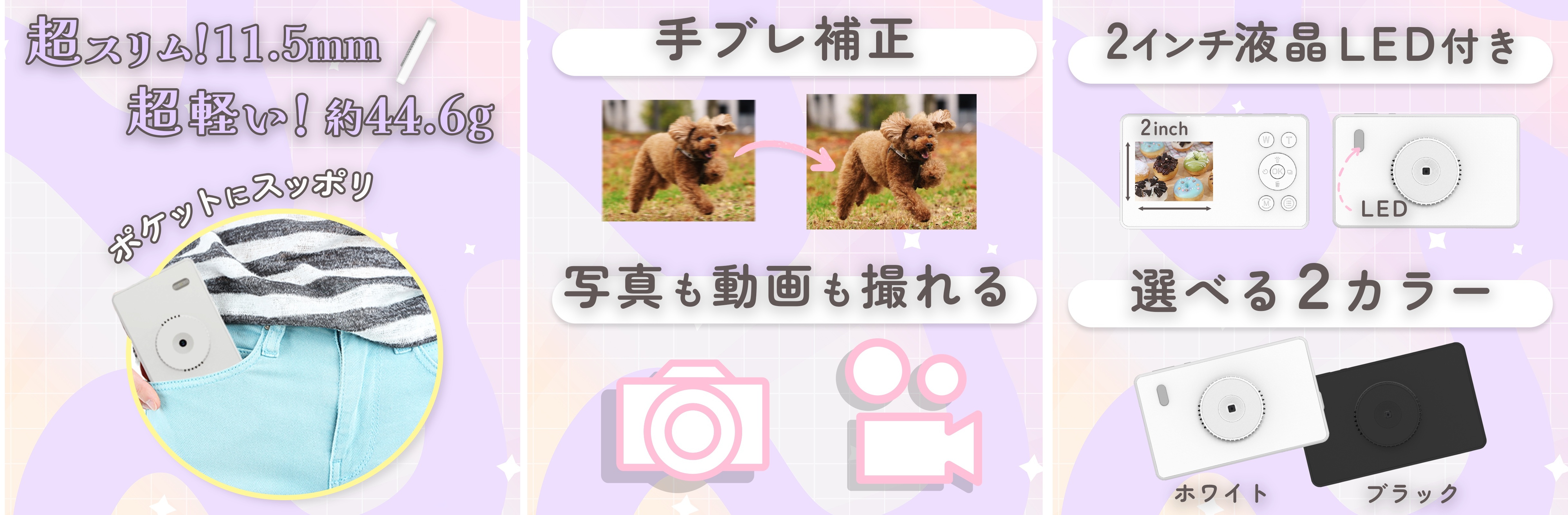 また、写真撮影はもちろん、動画撮影も可能で、デジタル4倍ズームや電子式手振れ補正にも対応。さらに、2インチ液晶モニターとLEDライト付きで、暗い場所でも手軽に使用することができる。