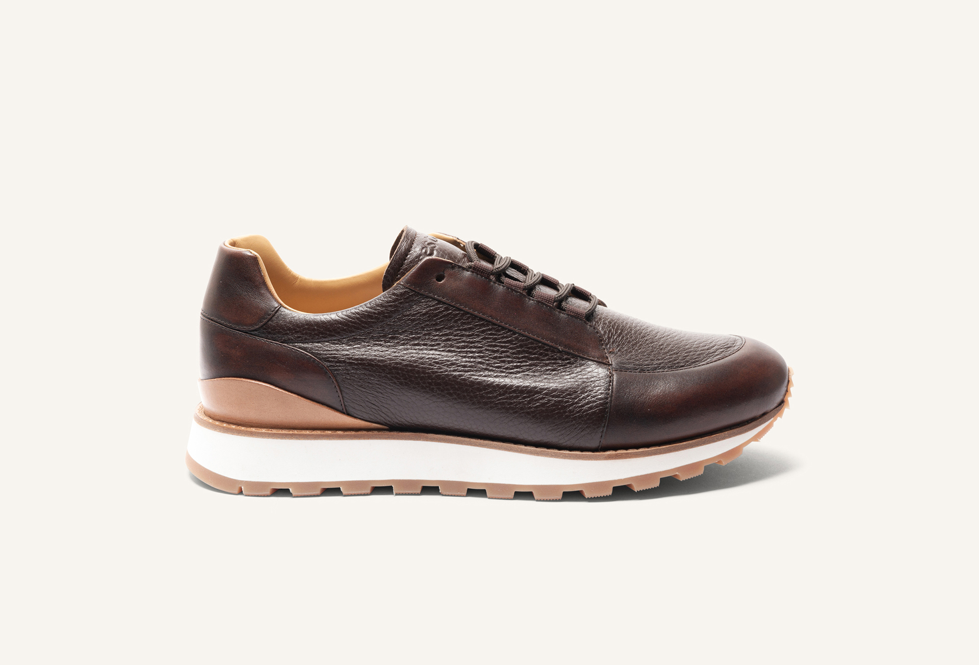 鹿革を用いたアッパーにより、足なじみのいい柔らかさが 特徴的。インソールにtestoniのロゴをあしらったモエナスニーカーは、クラフツマンシップと革新的なデザインをシームレスに繋いでいる。