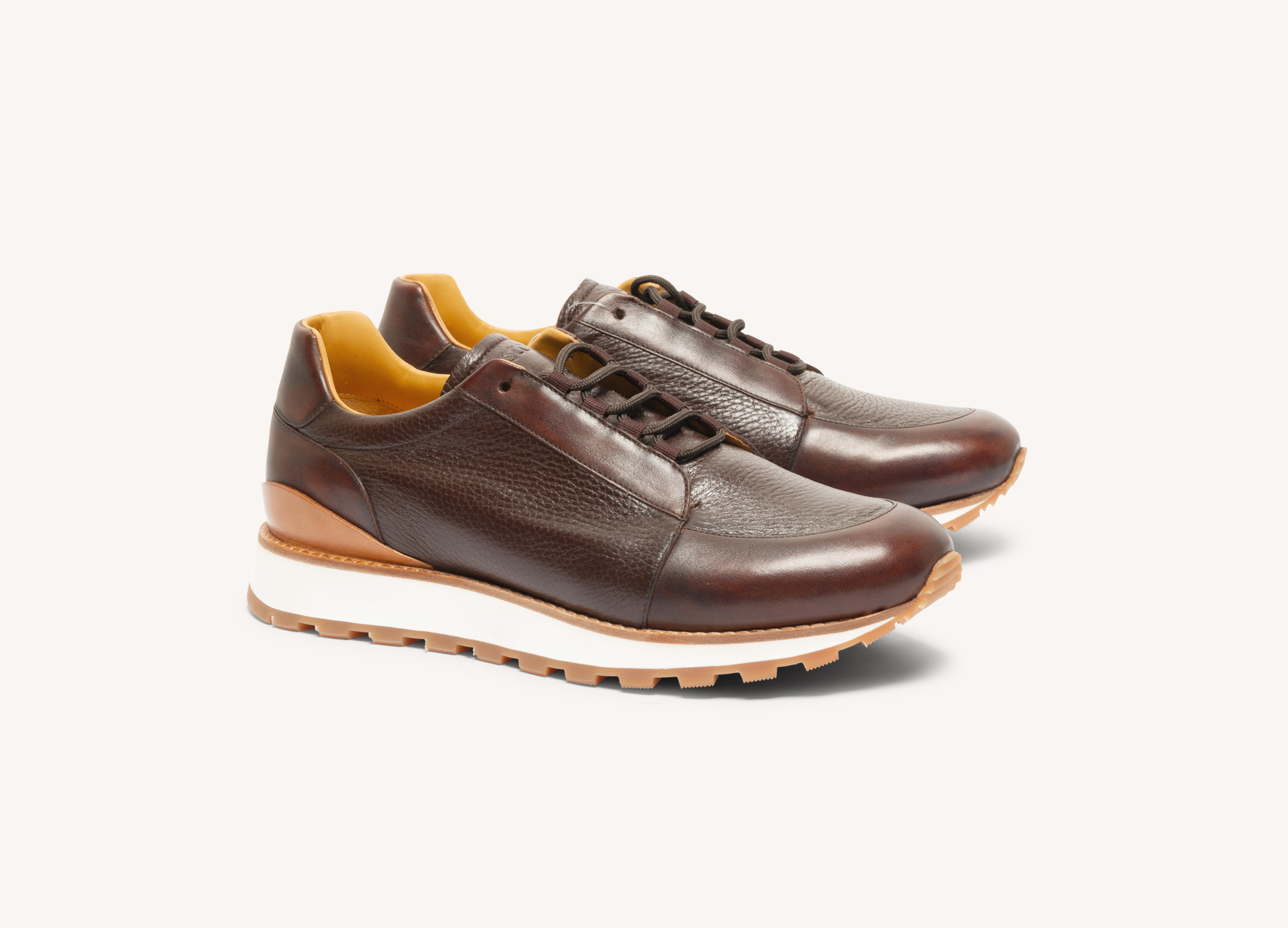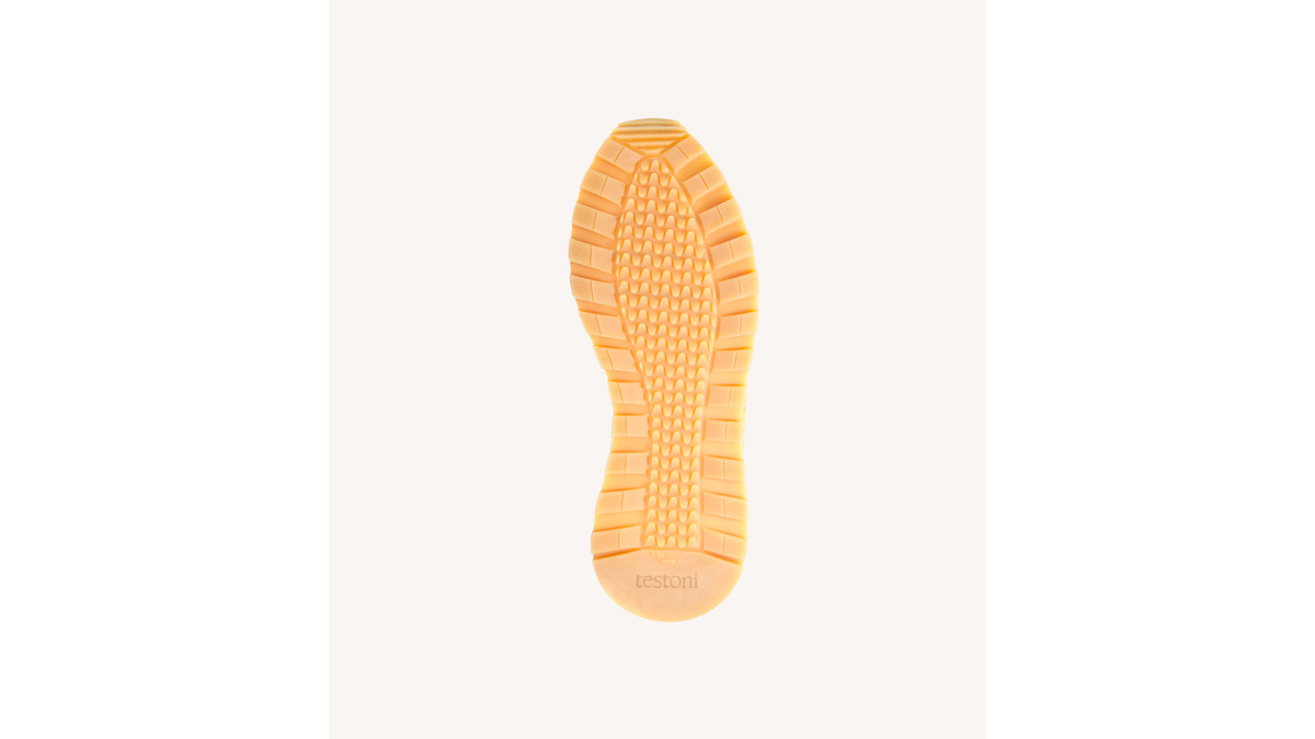 ホワイトとハニーを上品にミックスしたトレッドラバーソールと、ボロネーゼの「サケット」構造で補強した比類のない快適さと柔軟性を持つスニーカー。