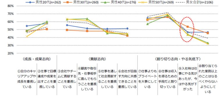 女性は「(7)プライベートを大事に」「(8)仕事は収入を得る手段」と割り切る傾向が強くなる。性別役割意識が垣間見えるが、「(9)やる気が下がった」割合、「(10)割り当てられた業務以上のことはなるべくやらない」割合に男女差はない。