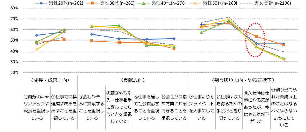 男性20~30代には「(10)割り当てられた業務以上のことはなるべくやらない」傾向が比較的見られる。男性20代の結果からは「(3)会社やチーム」「(4)顧客や取引先・仕事相手」への貢献よりも自身の「(1)キャリアアップや成長」を重視していることもうかがえる。
