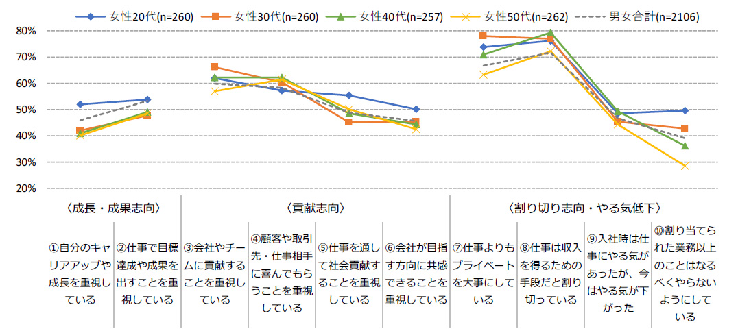 女性では、20代で「(1)キャリアアップや成長」を重視、30~50代で〈成長・成果志向〉が低めだ。女性20~40代は〈割り切り志向〉が高めで、特に20代では「(10)割り当てられた業務以上のことはなるべくやらない」割合が高かった。