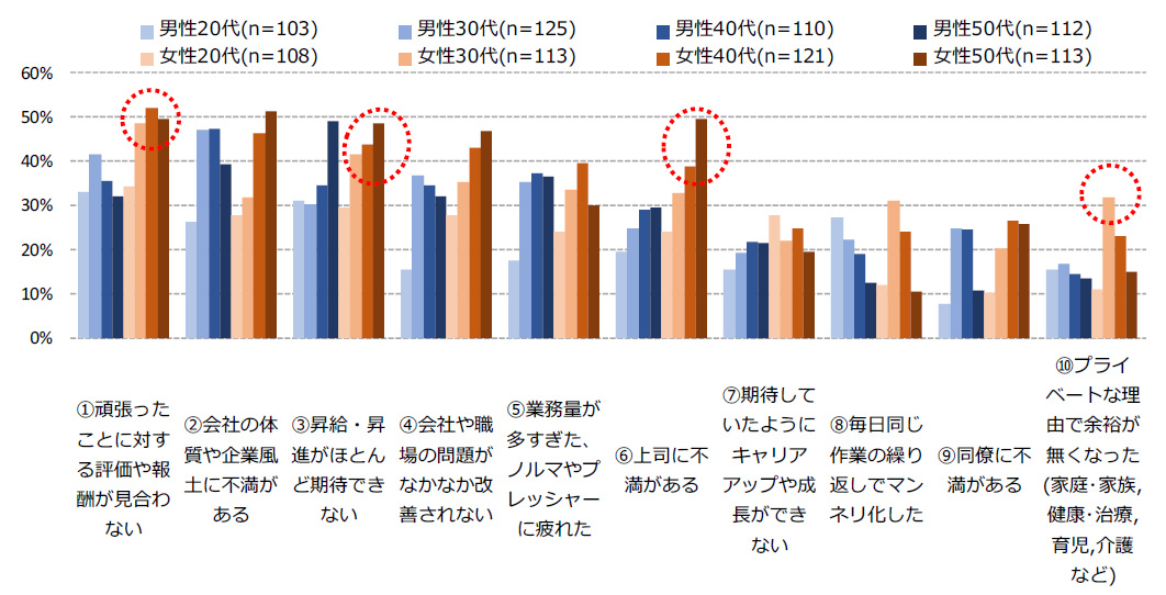 ・女性40~50代は、「(1)評価や報酬が見合わない」「(3)昇給・昇進が期待できない」「(4)問題が改善されない」「(6)上司に不満」を挙げる割合が高い。