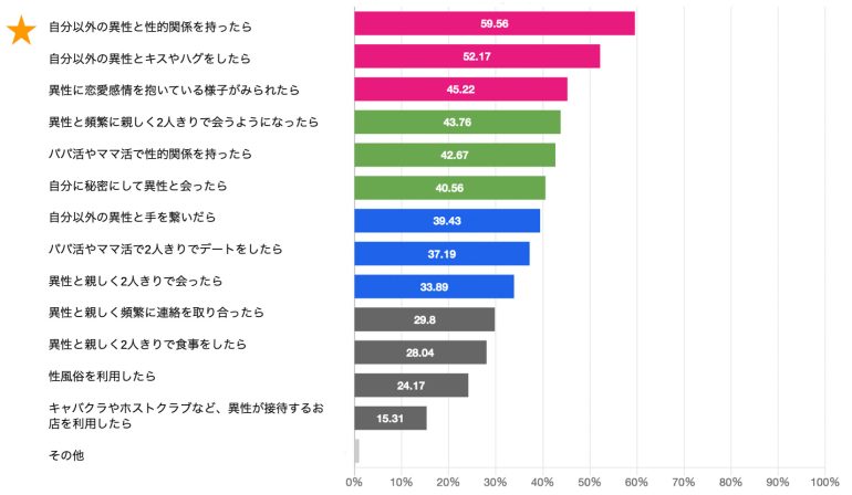 次に多かったのは「自分以外の異性とキスやハグをしたら」で、こちらも5割を超える人が「浮気」と認識していることがわかった。3番目は「異性に恋愛感情を抱いている様子がみられたら」だが、グラフの通り5割には届かなかった。