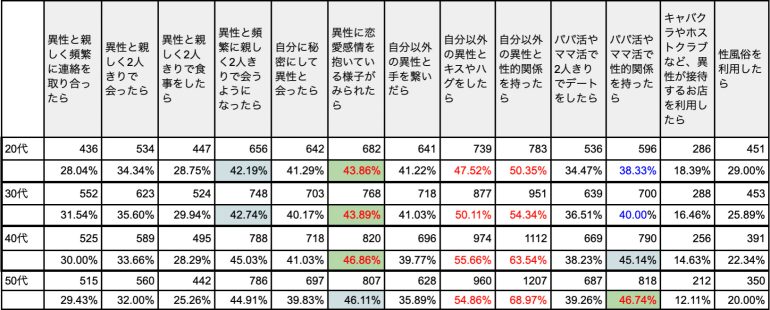 3番目については「異性に恋愛感情を抱いている様子がみられたら」浮気と回答する人がどの年代も多い印象だが、50代の人は「パパ活ママ活で性的関係を持ったら」浮気と回答する人が他の年代より多い結果となり、年齢が高くなるにつれ恋愛感情よりも性的関係を重視する傾向がうかがえる。