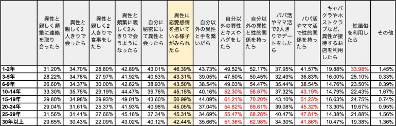 また、結婚してから1-2年目の人は、「性風俗を利用したら」浮気と考える人が、結婚年数の長い人より多いことがわかった。