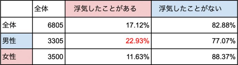 男女で比較すると、男性のほうが2倍近くも浮気率が高くなっていた。また、割合でみれば既婚者男性5人に1人以上に浮気経験ありという結果になった。