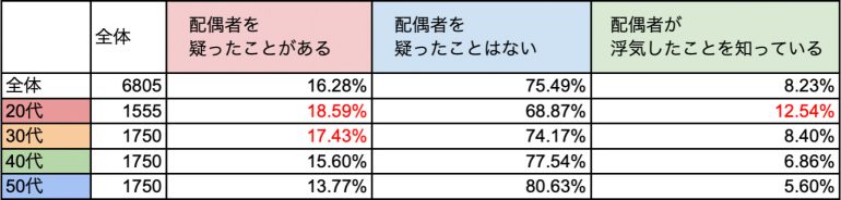 世代別に比較すると、若い世代のほうが、「疑ったことがある」という人が多く、平均を上回る結果になった。20代については、「浮気したことを知っている」割合も多い結果となった。