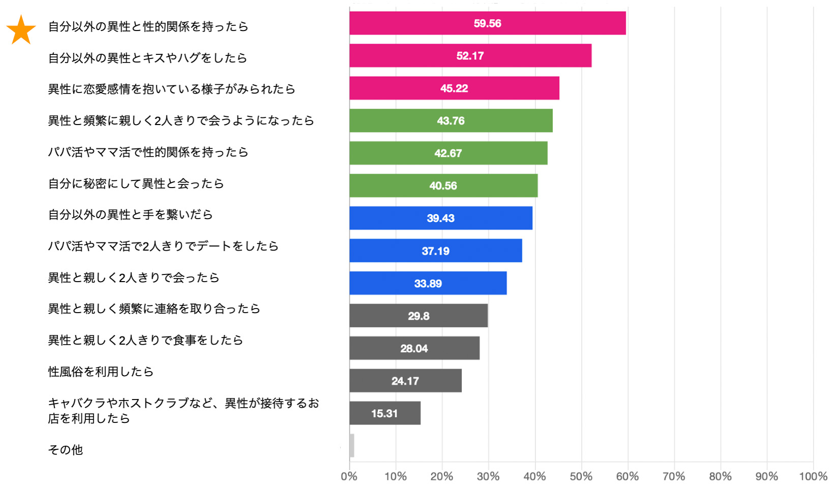 男性の回答で注目されるのは「パパ活やママ活で性的関係を持つ」が3番目に高い割合になっている点。男性は女性よりも「性的関係」を重視することがわかる。