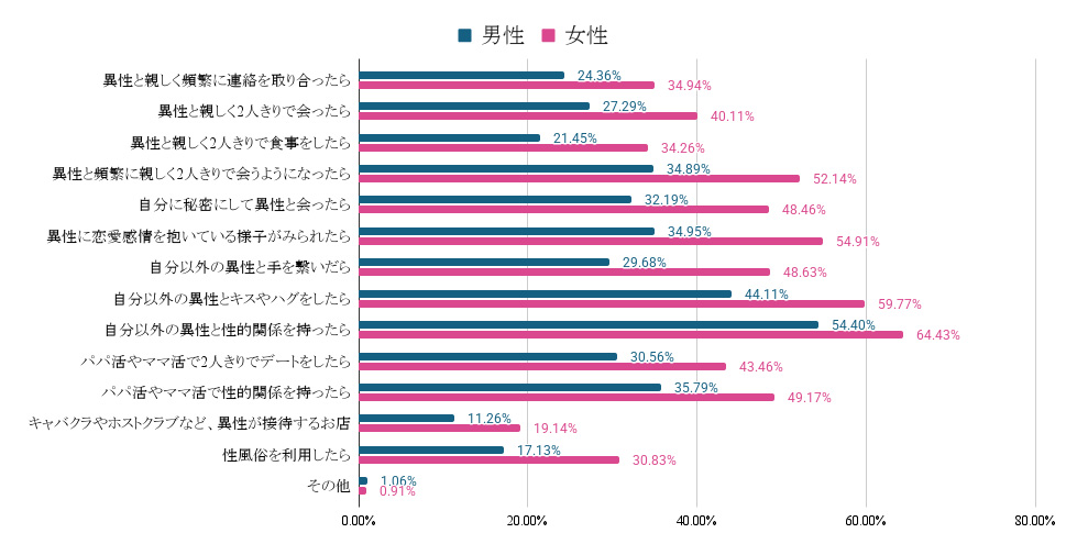 特に「異性と頻繁に親しく2人きりで会う」は、男性と女性で22%もの差が開いており、女性のほうが、浮気の判断基準に「恋愛感情や親密性」を重視している傾向が見て取れた。