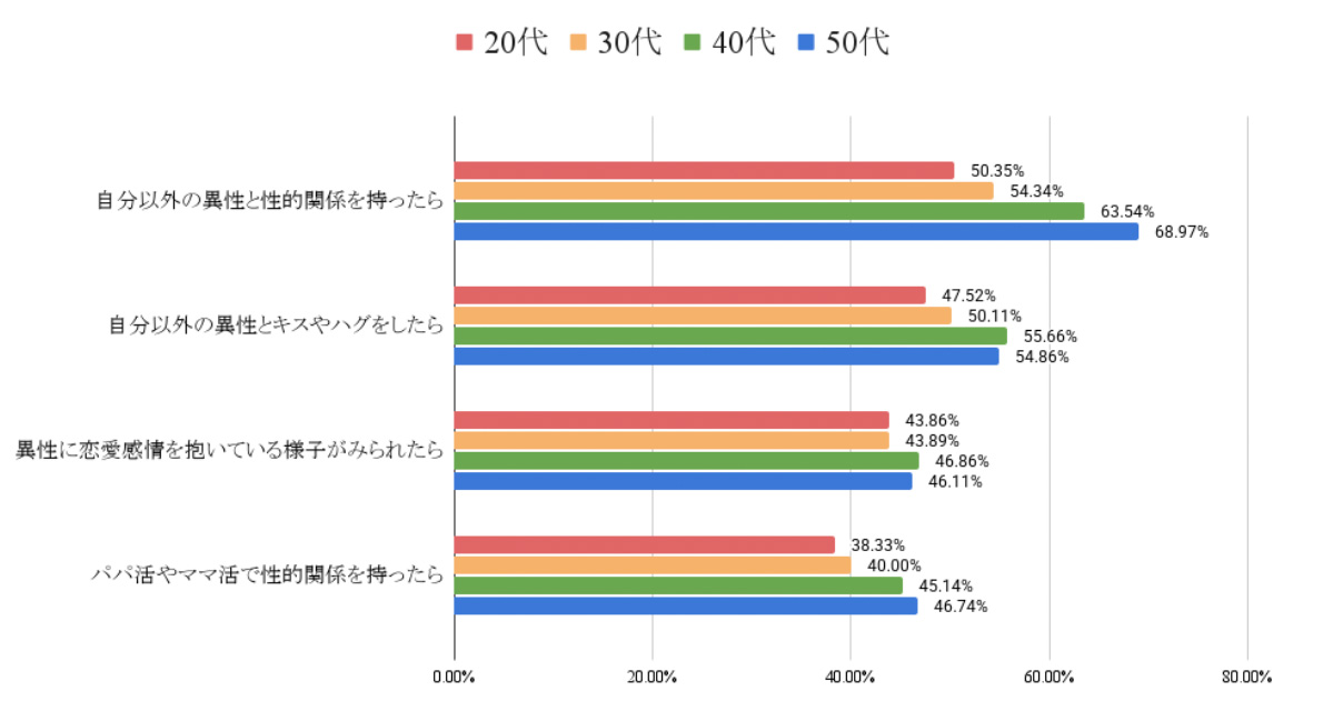 「パパ活ママ活で性的関係を持ったら浮気」と回答する割合は、50代でこそ3番目に多い結果だったが、20代・30代においては以下の3つを選択した回答者数より少ない結果となっている。
