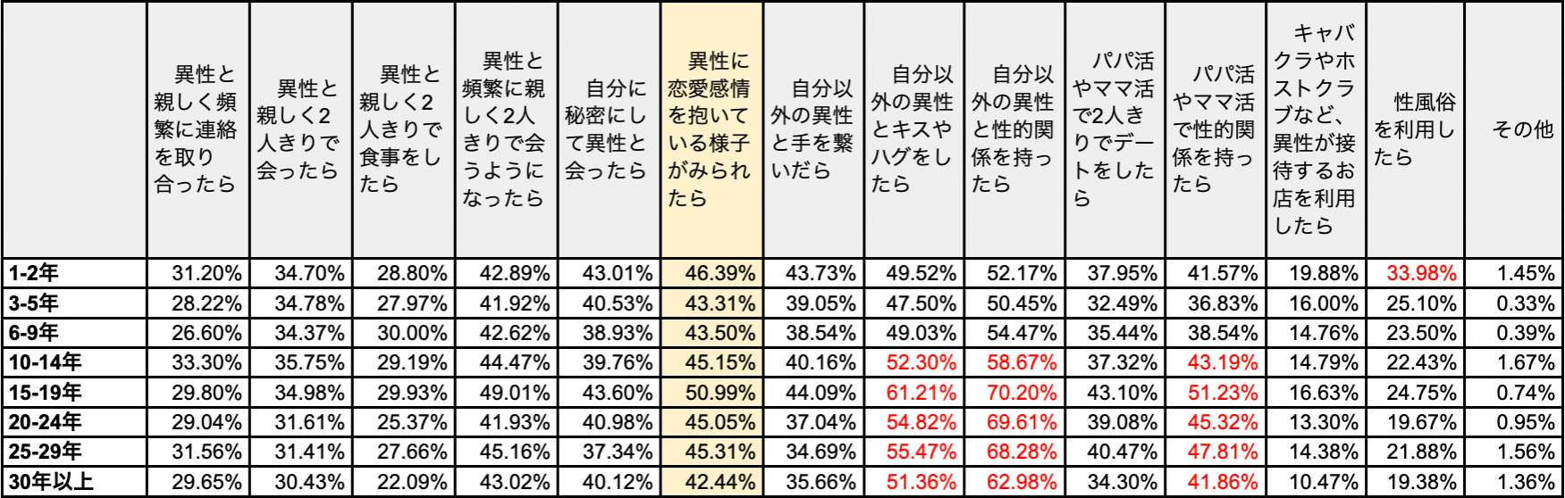 また、結婚してから1-2年目の人は、「性風俗を利用したら」浮気と考える人が、結婚年数の長い人より多いことがわかった。