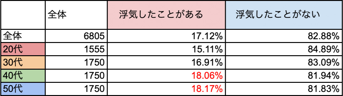 世代別に比較してみると、浮気率は年齢に比例して高くなる傾向で、40代50代はそれぞれ18%の人が浮気したことがあるという結果になった。