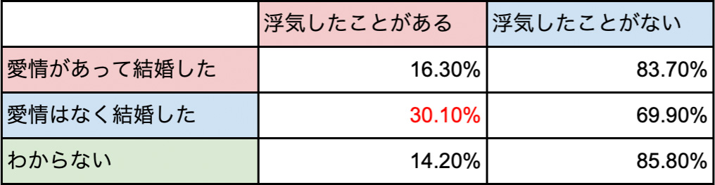 「愛情があって結婚した人」と「愛情はなく結婚した人」の浮気率を比べたところ、愛情はなく結婚した人のほうが、倍近くも「浮気経験あり」という結果になった。愛情はなく結婚した人の中で浮気経験ありは、3割にも上った。