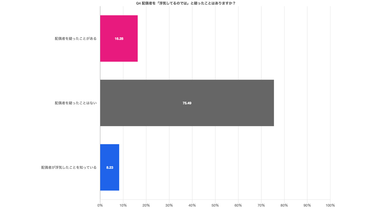 既婚者の20代から50代の男女約7,000人に「配偶者が浮気してると疑ったことはあるか」と尋ねたところ、「配偶者の浮気を疑ったことがある」人は16%程度となった。